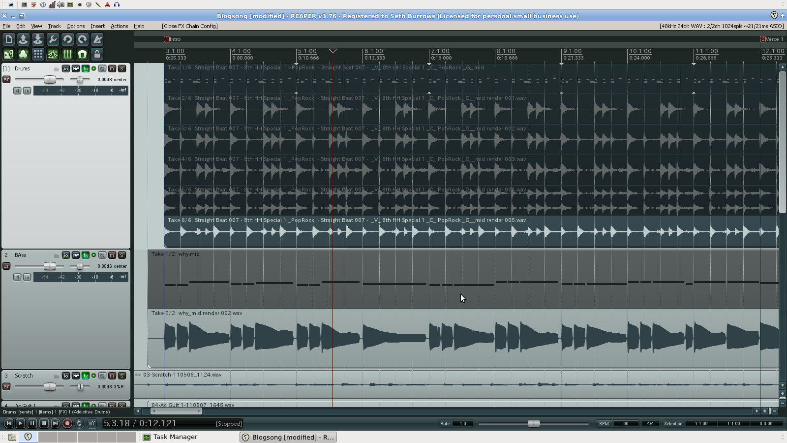 See, after I’m finished with the electric guitars, I like to go in and add unique, custom drum fills for between each of the section, tighten up the relationship between the bass and the kick drum and the bass and the guitars. After I have the bass part pretty much figured out, I render it as a new take, so I can start treating it like audio and not MIDI.
