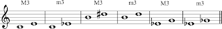 Similarly, Major Thirds have a specific definition. Major Thirds are two notes separated by two whole steps, or four semi-tones. Here are a few examples of Major Thirds:
