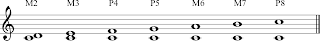 Here is what the intervals of the major scale look like when played Harmonically in the staff: