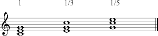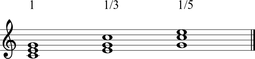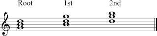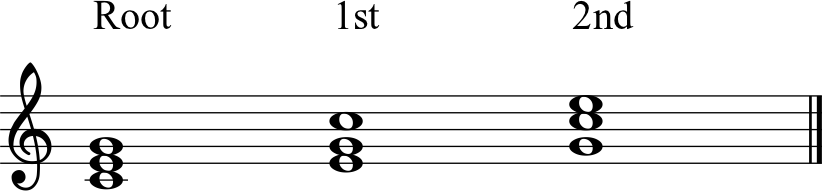 Normally, when we write out chords on the staff for theory purposes, we write them in a form that is called “Close Voiced Root Position.” This means that the notes of the chord are stacked on top of each other in order with the root, that is, the note that the chord is named after, on the bottom. In the key of C, from low to high, this would be spelled C E G or Numerically, 1 3 5. There are two other ways to organize these notes, in a close way. if you simply move the bottom note up an octave, the spelling of the chord becomes E G C, or numerically 3 5 1. This chord is said to be a “1st Inversion Close Voiced C Major Chord.” If you take this 1st Inversion C Major chord, and again take the note on the bottom and move it up an octave, the spelling of the chord becomes G C E, or numerically, 5 1 3. This chord, with the 5 on the bottom , is said to be a “2nd Inversion Close Voiced C Major Chord.” Here’s how the three different inversions of a C Major chord look in the Staff: