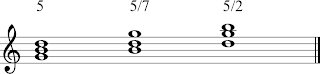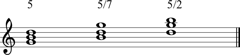 So a “5” chord is assumed to have its root in the bass, the “5/7” chord is a “5” chord with the “7” of the KEY (in this case the key of C major). So the 7th note of C Major is “B.” Therefore, the “5/7” chord in the key of C is a G chord with a “B” in the bass. Similarly, the “5/2” is a 5 chord in the key of C, or G Major, with the “2” of the Key, or “D” in the Bass.